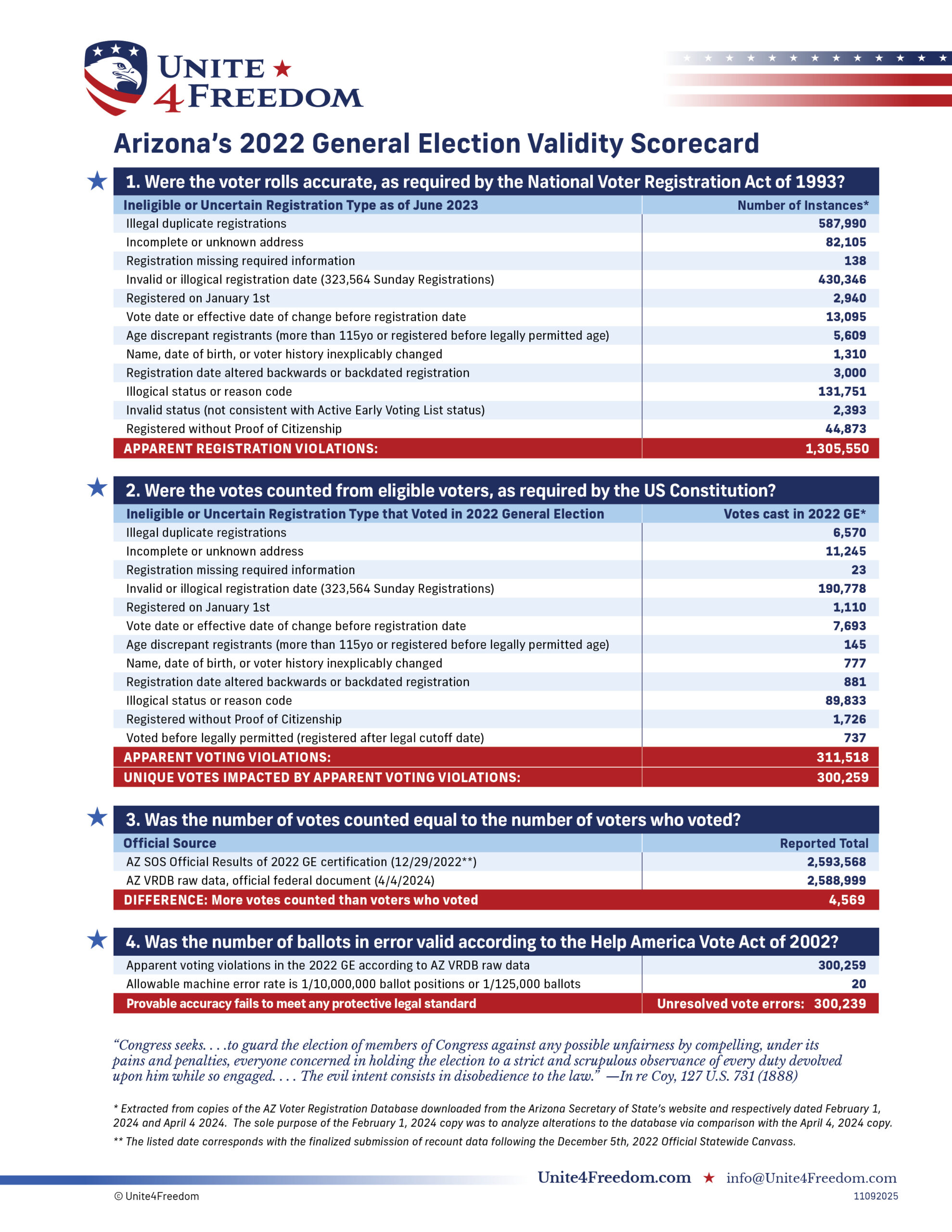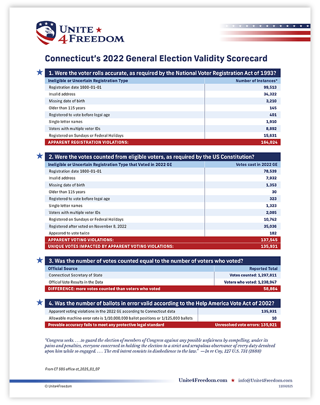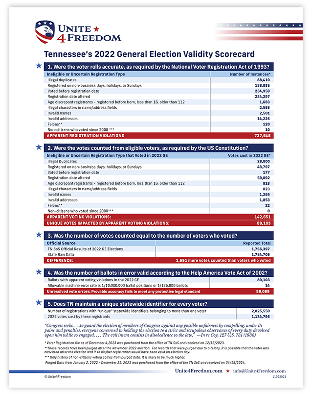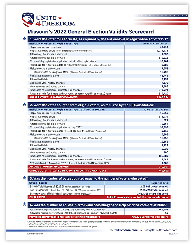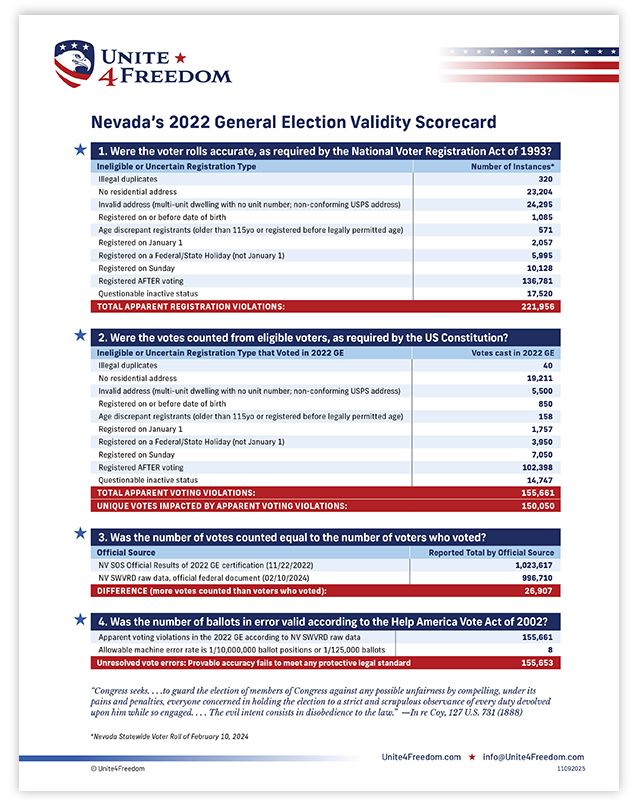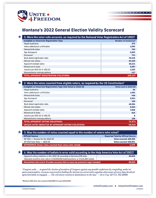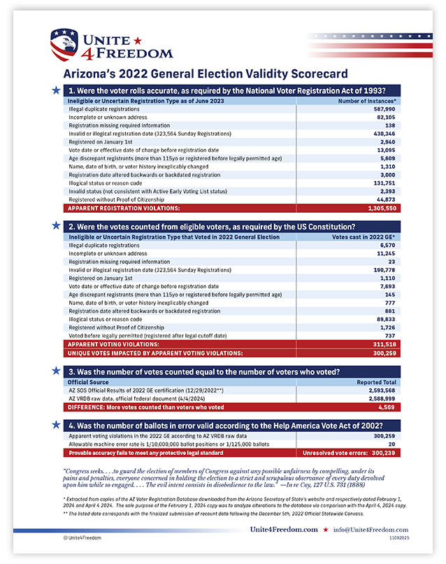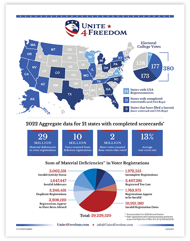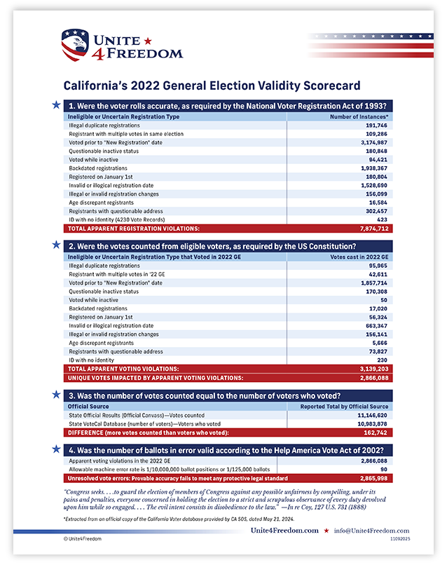 Unite4Freedom is the first organization in the country to conduct these types of forensic audits using each state’s own official data. The result is undeniable—millions of votes across the country, certified as accurate by election officials, originate from registrations that appear to violate election laws.