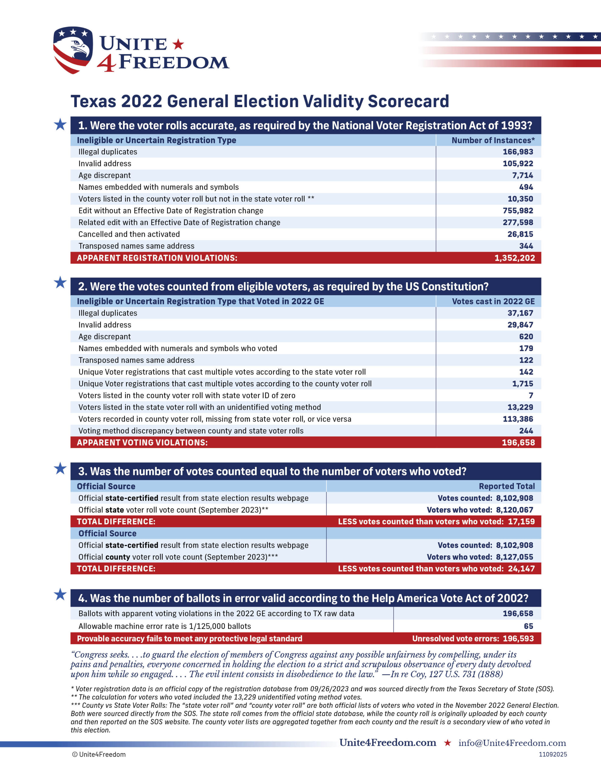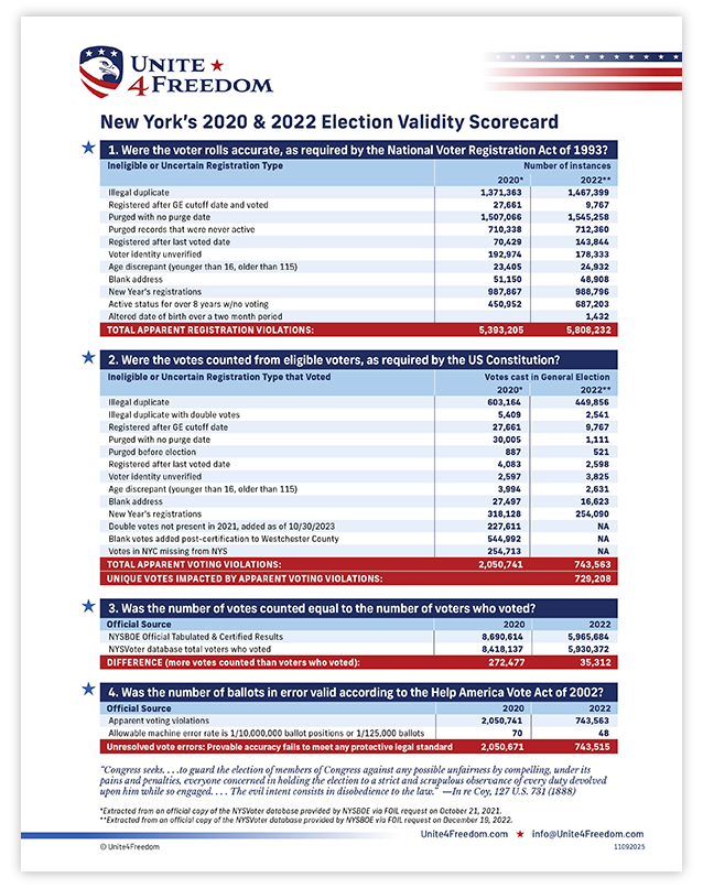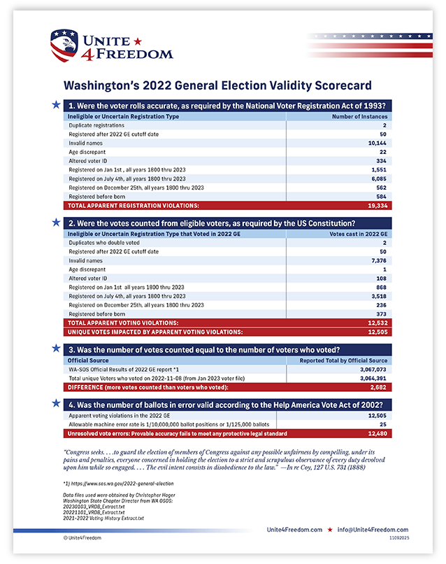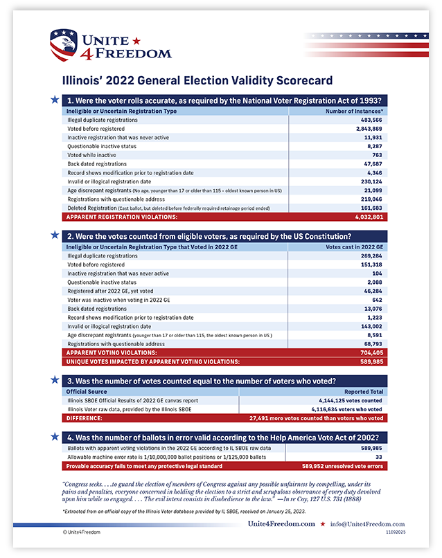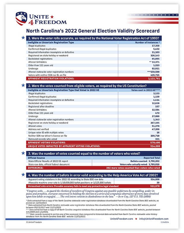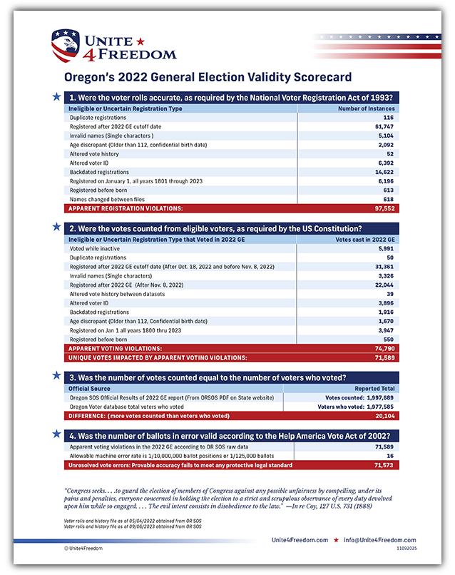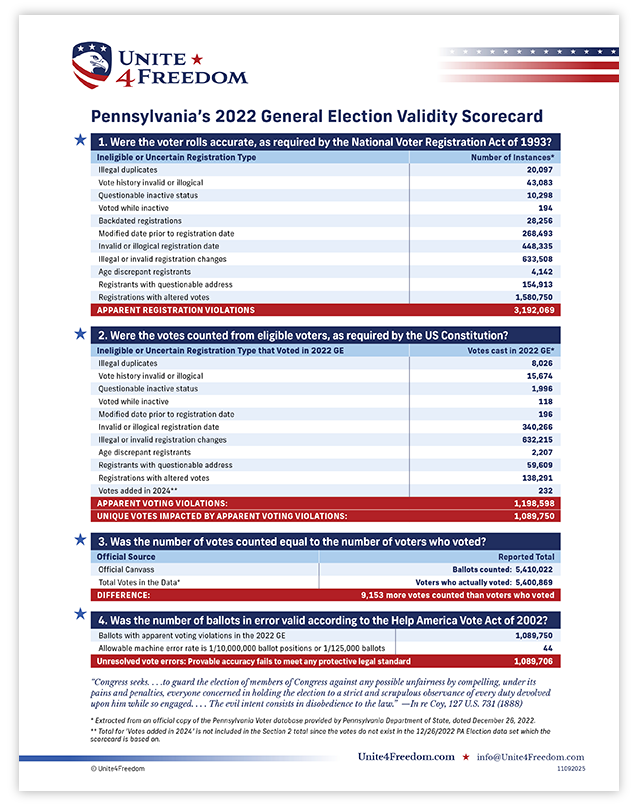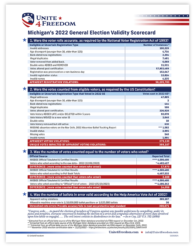 Unite4Freedom is the first organization in the country to conduct these types of forensic audits using each state’s own official data. The result is undeniable—millions of votes across the country, certified as accurate by election officials, originate from registrations that appear to violate election laws.