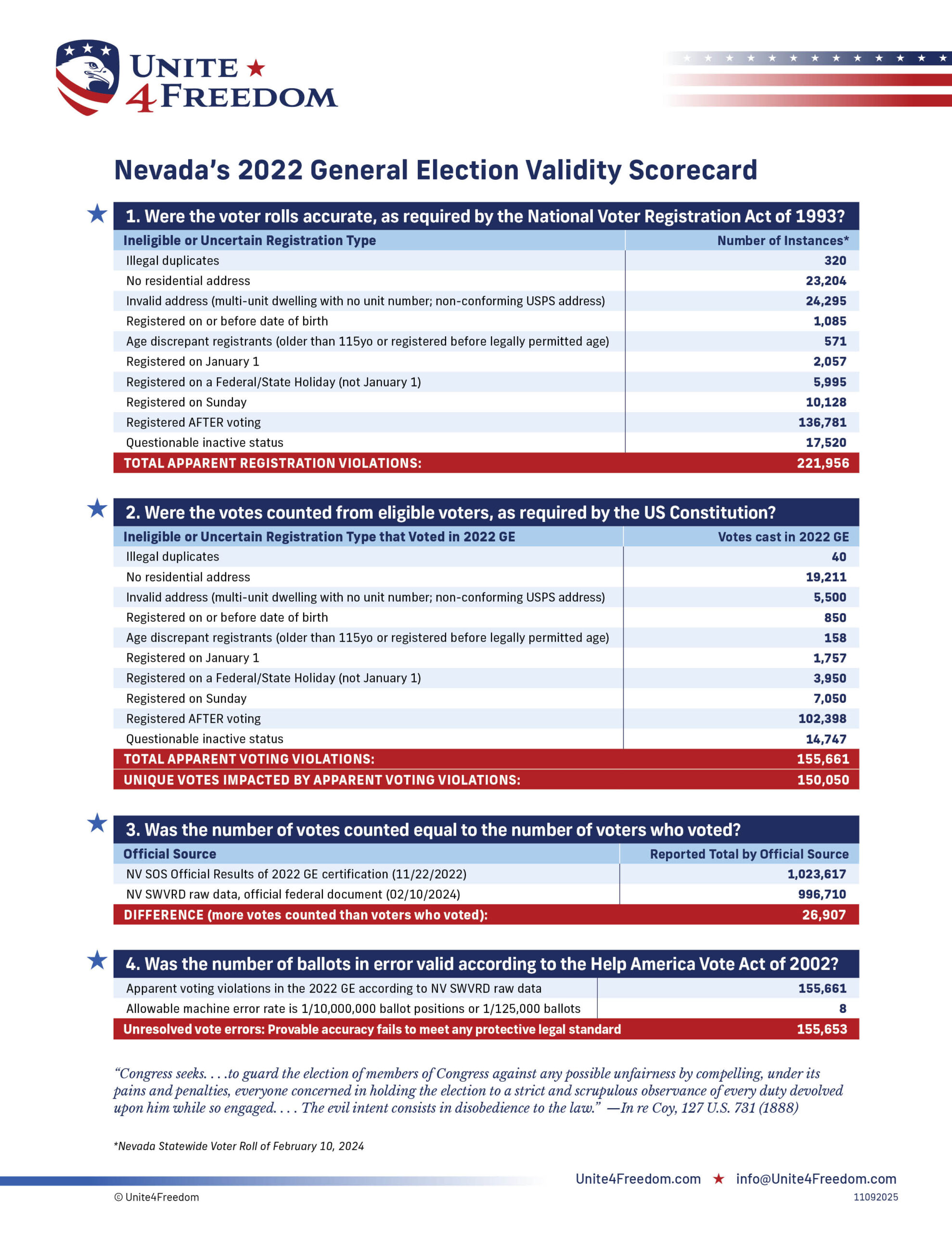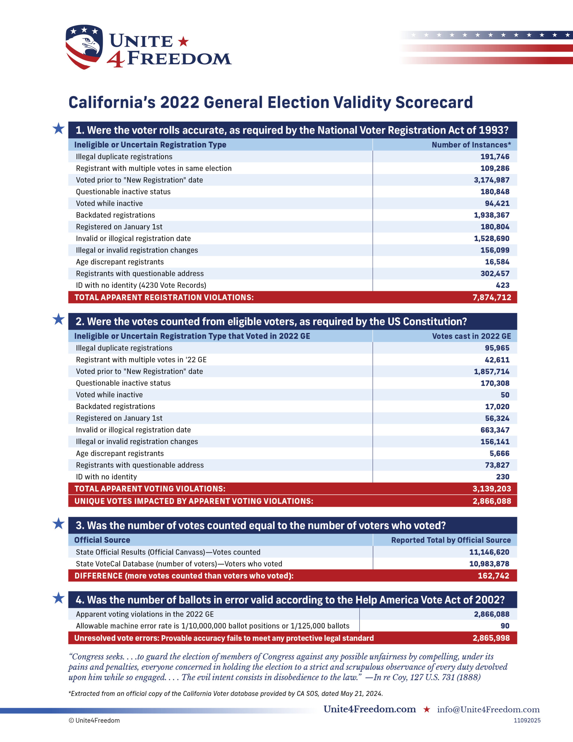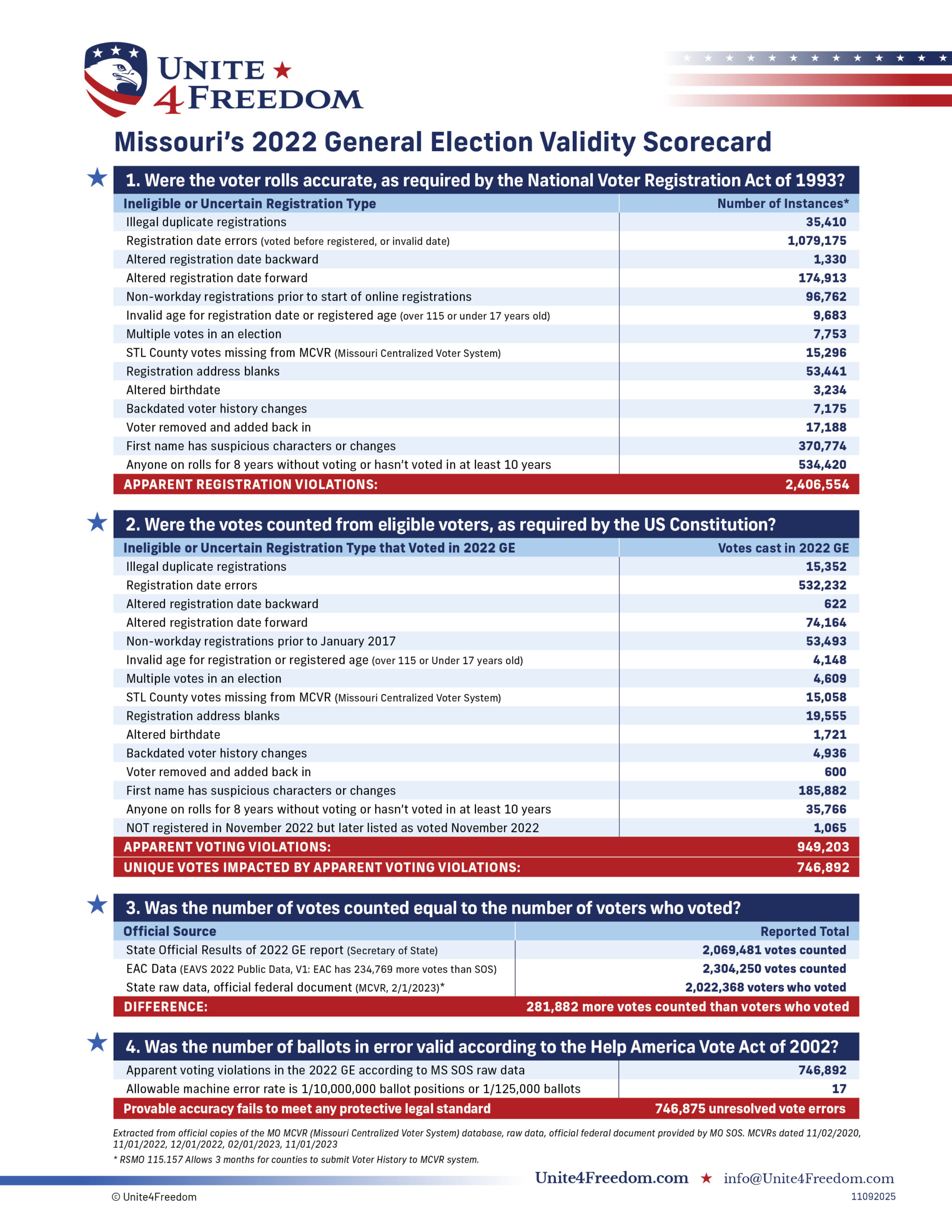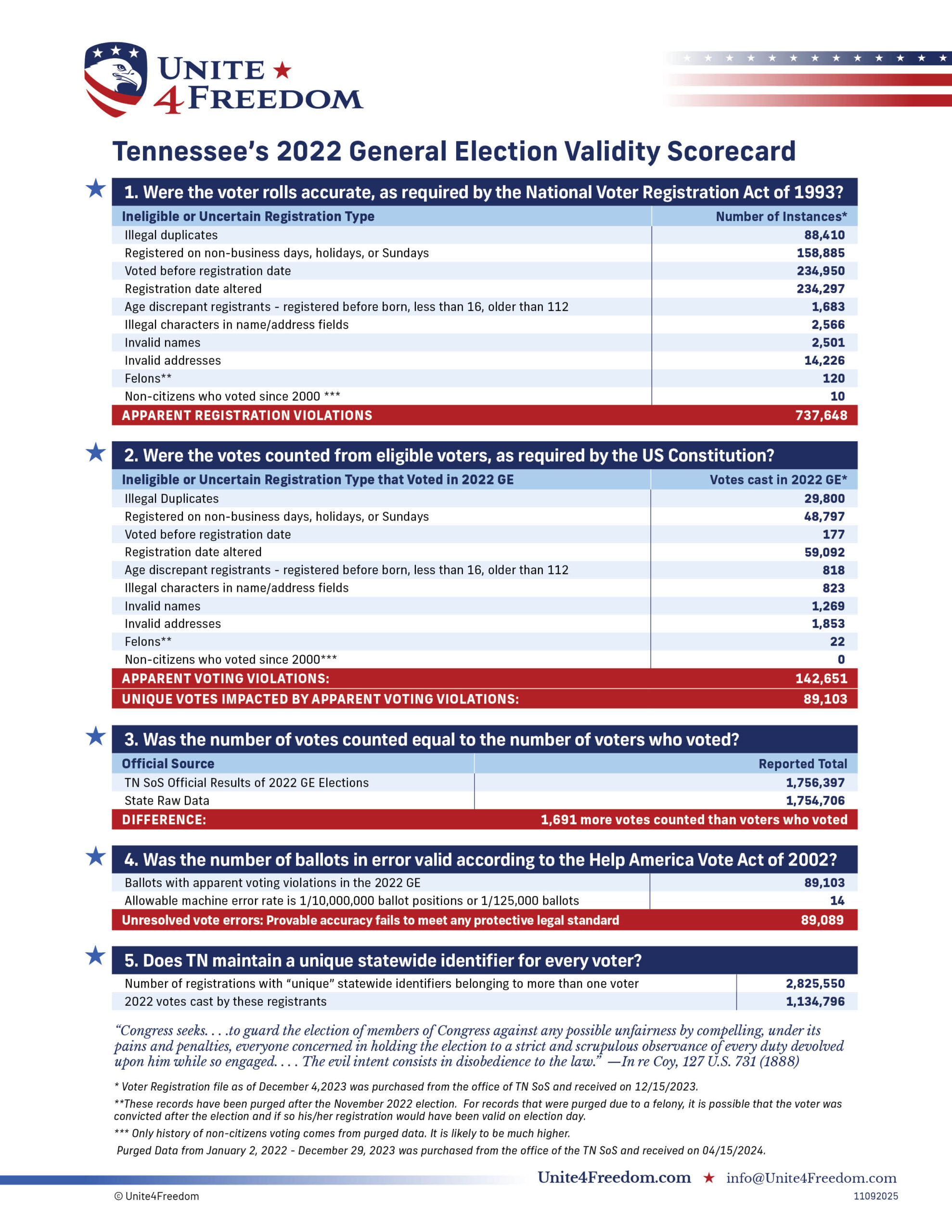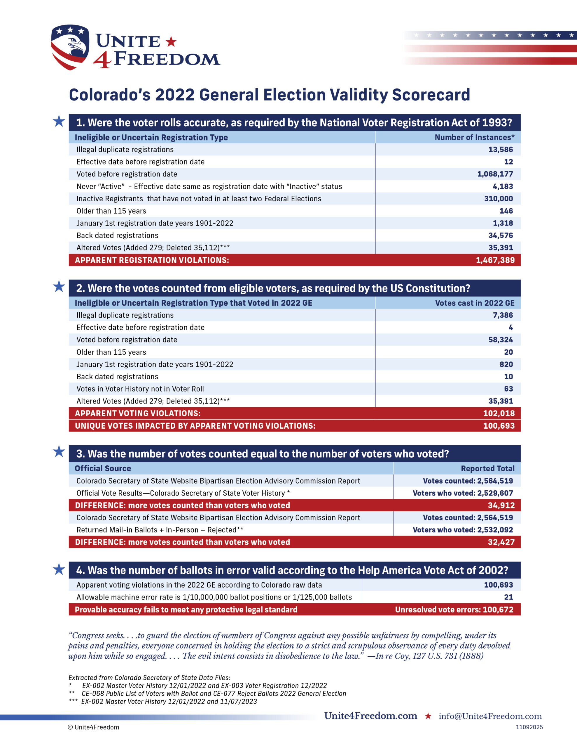 Unite4Freedom is the first organization in the country to conduct these types of forensic audits using each state’s own official data. The result is undeniable—millions of votes across the country, certified as accurate by election officials, originate from registrations that appear to violate election laws.