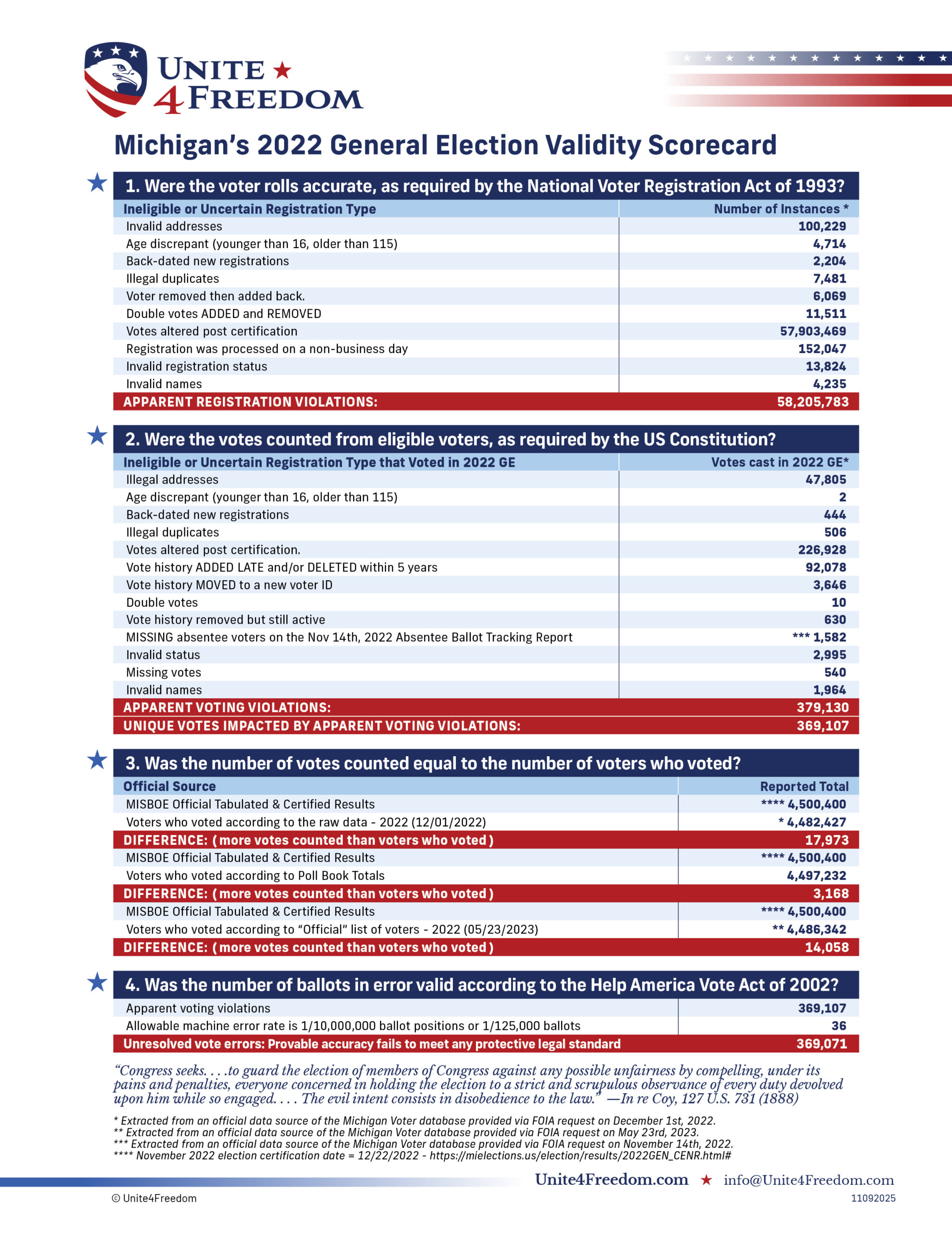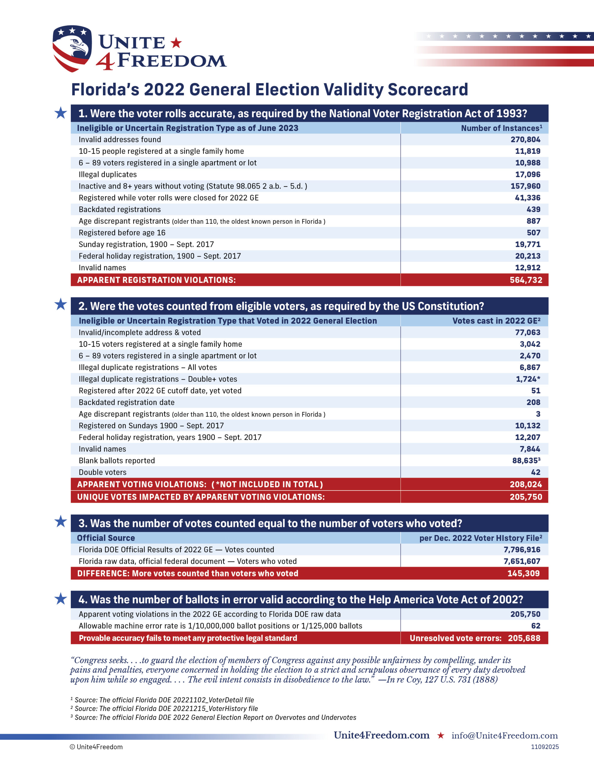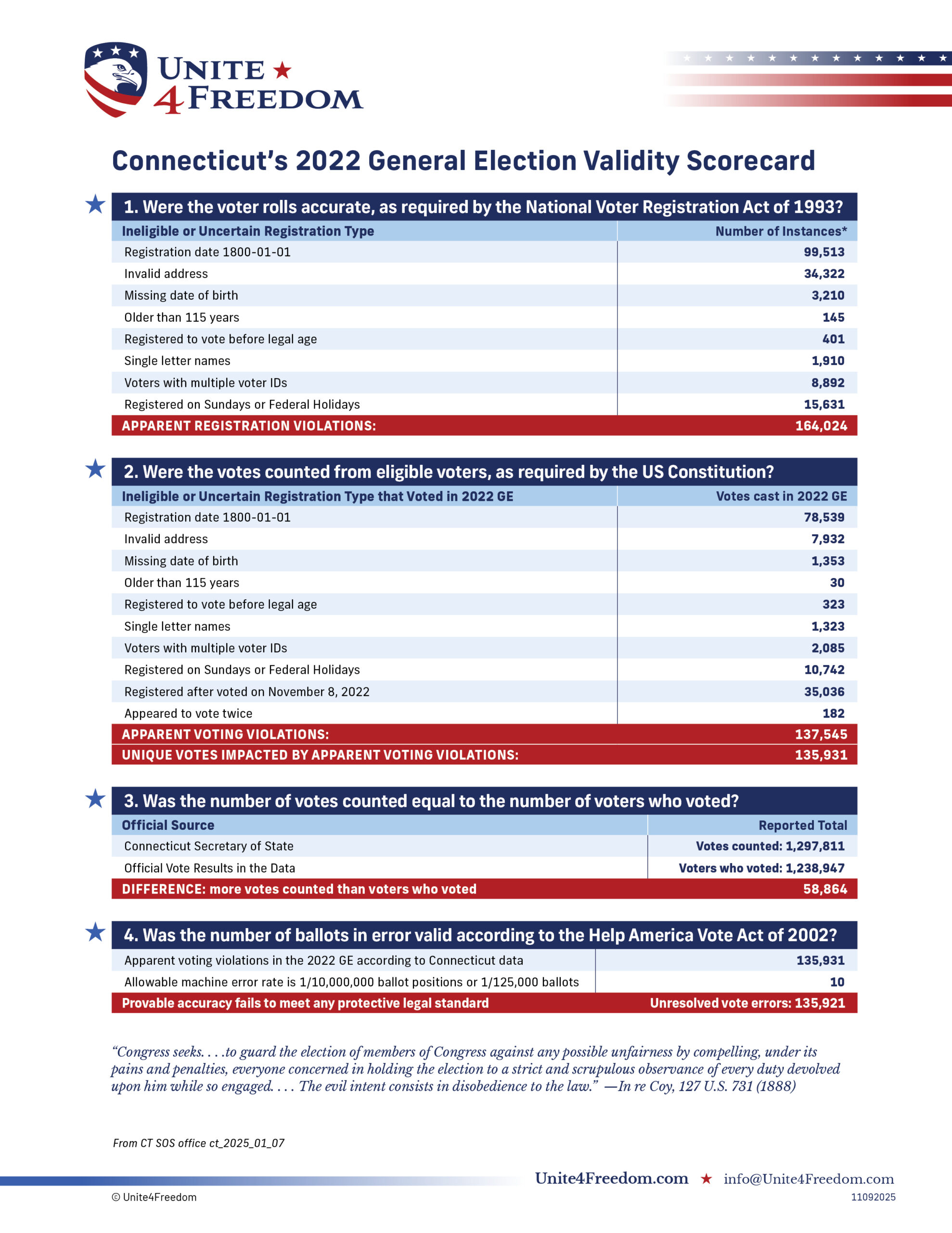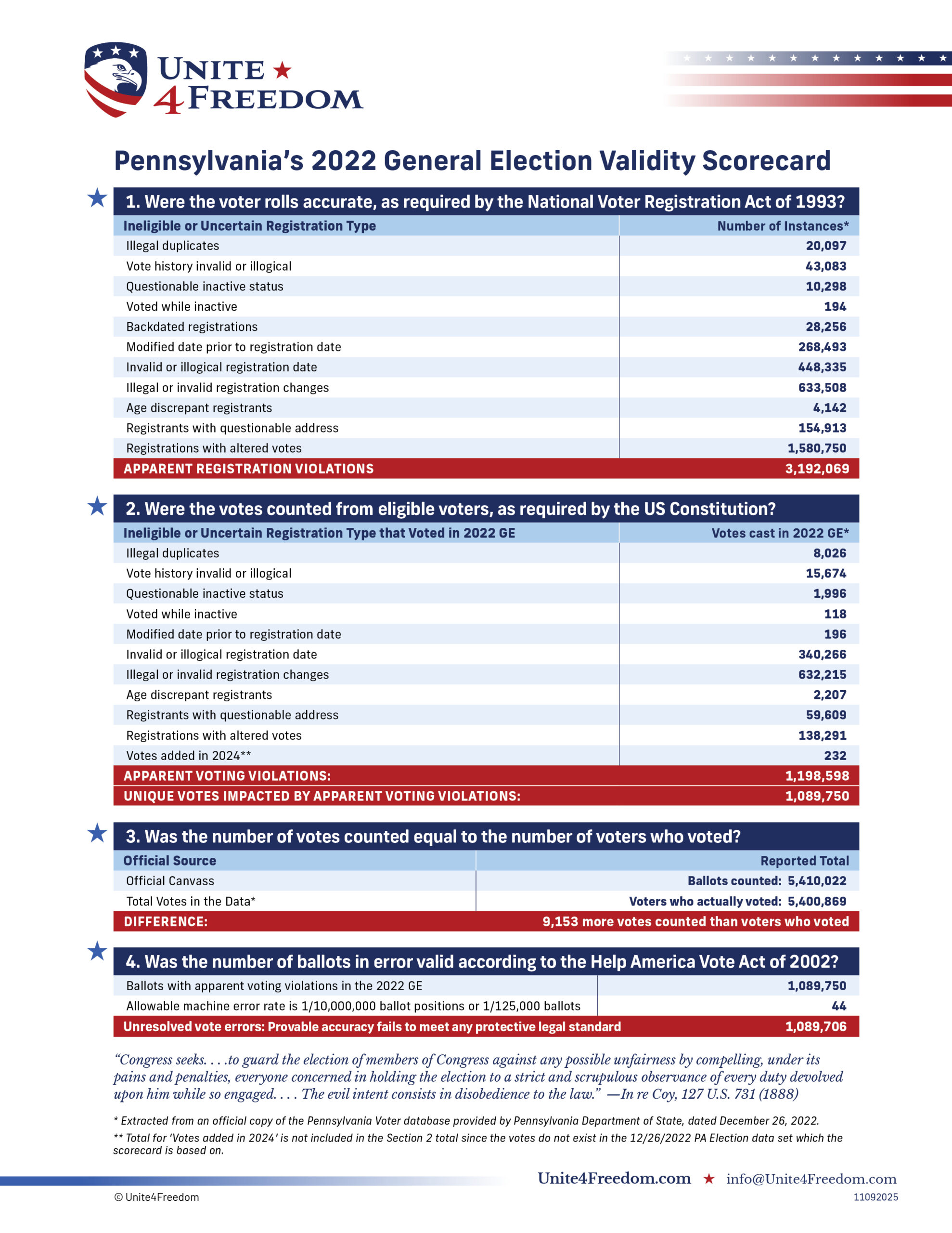 Unite4Freedom is the first organization in the country to conduct these types of forensic audits using each state’s own official data. The result is undeniable—millions of votes across the country, certified as accurate by election officials, originate from registrations that appear to violate election laws.