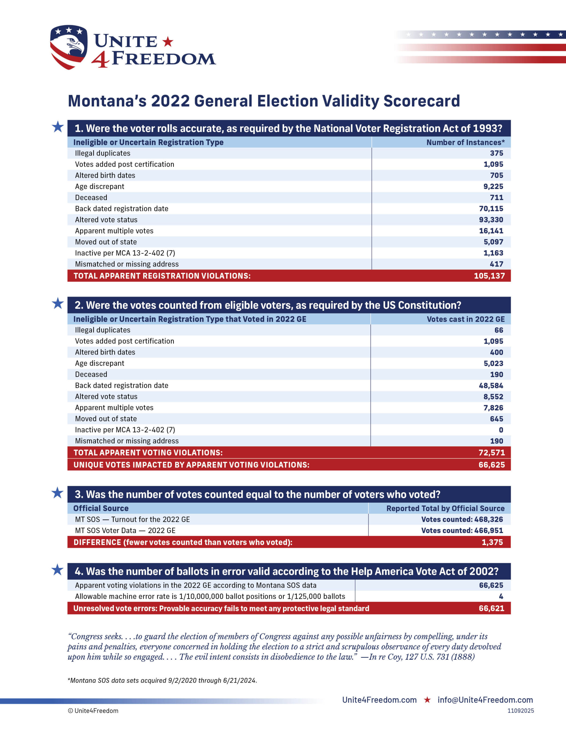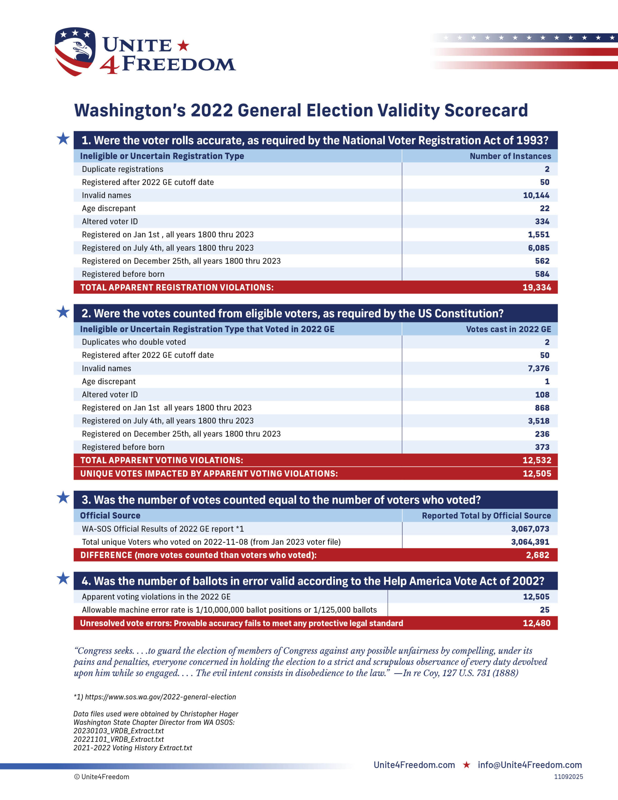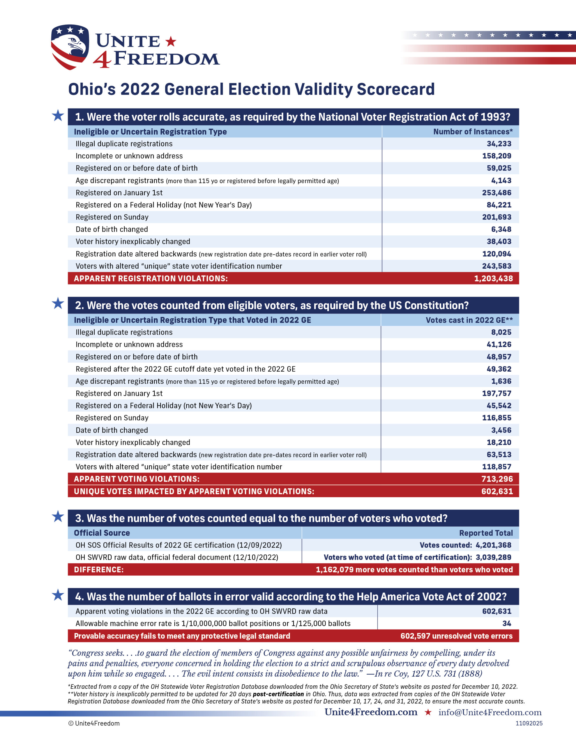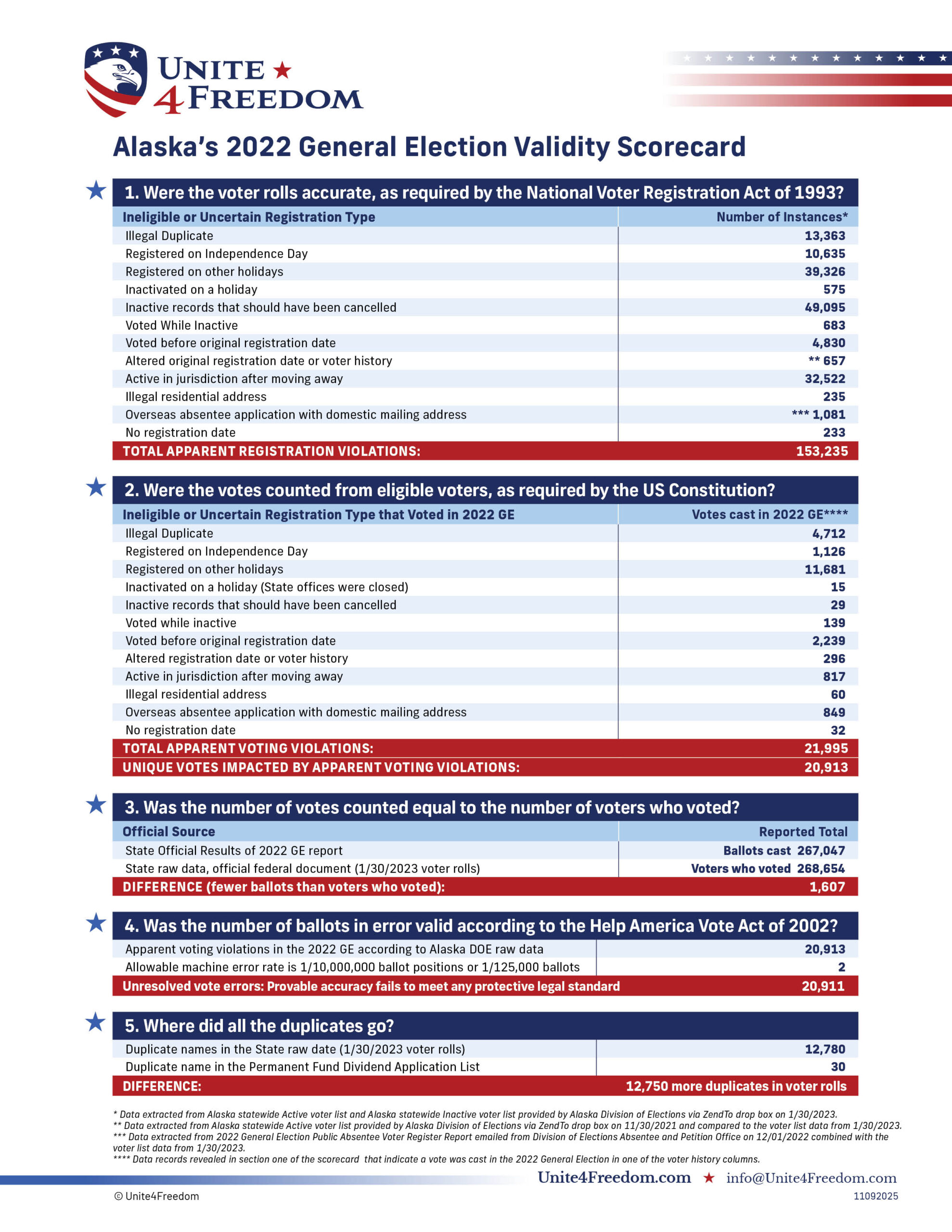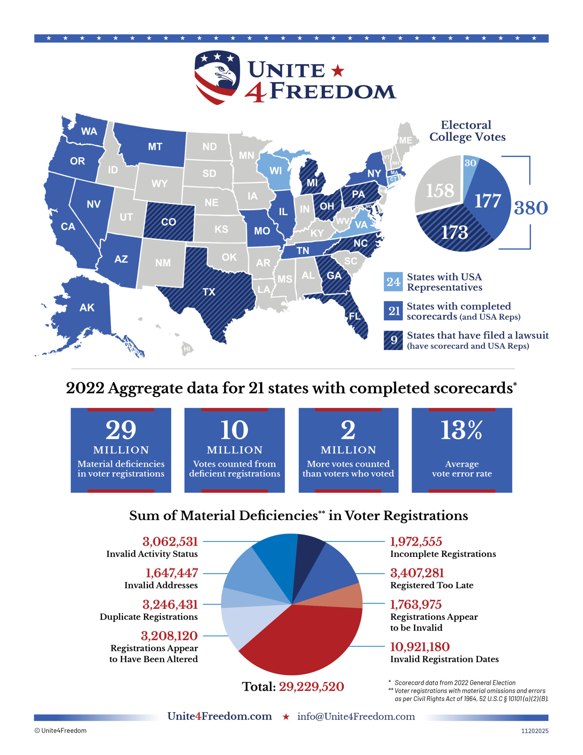 Unite4Freedom is the first organization in the country to conduct these types of forensic audits using each state’s own official data. The result is undeniable—millions of votes across the country, certified as accurate by election officials, originate from registrations that appear to violate election laws.