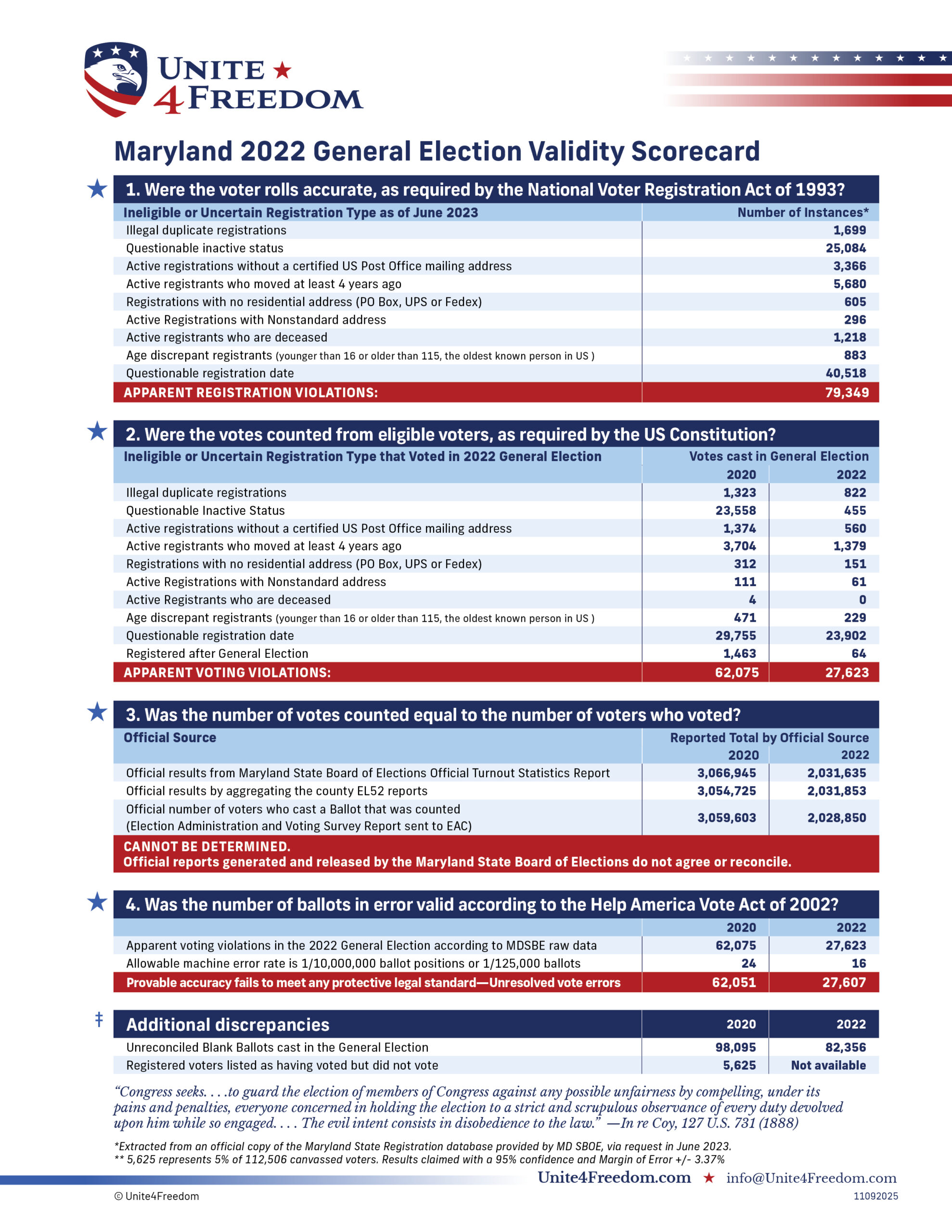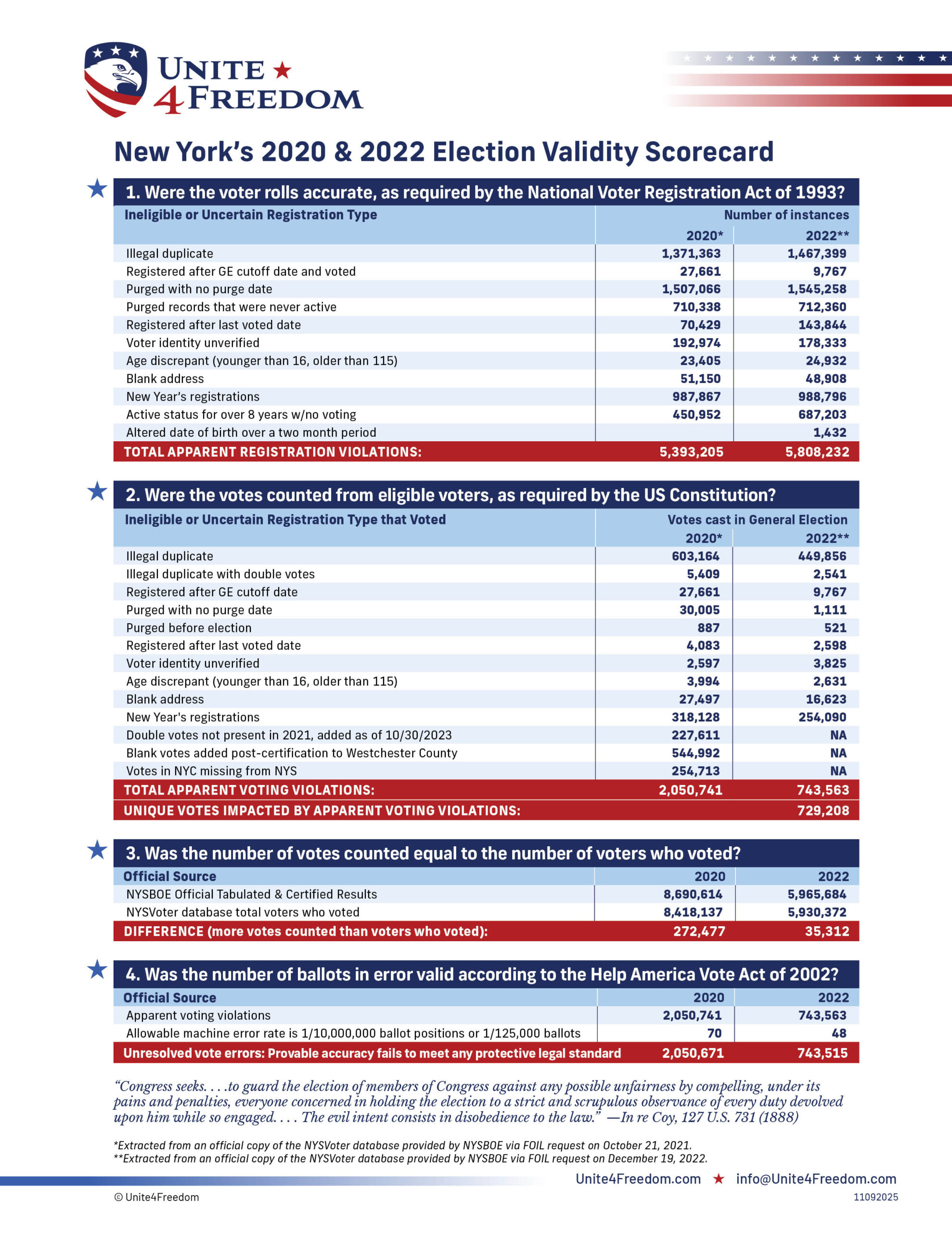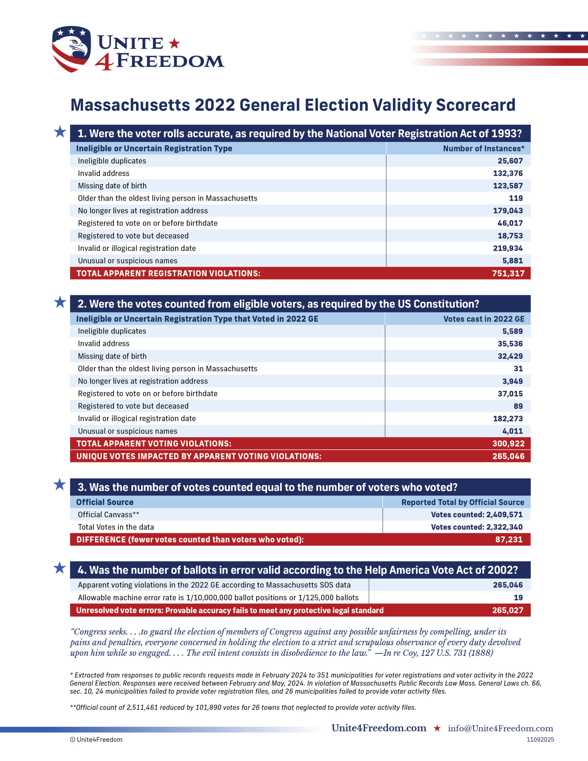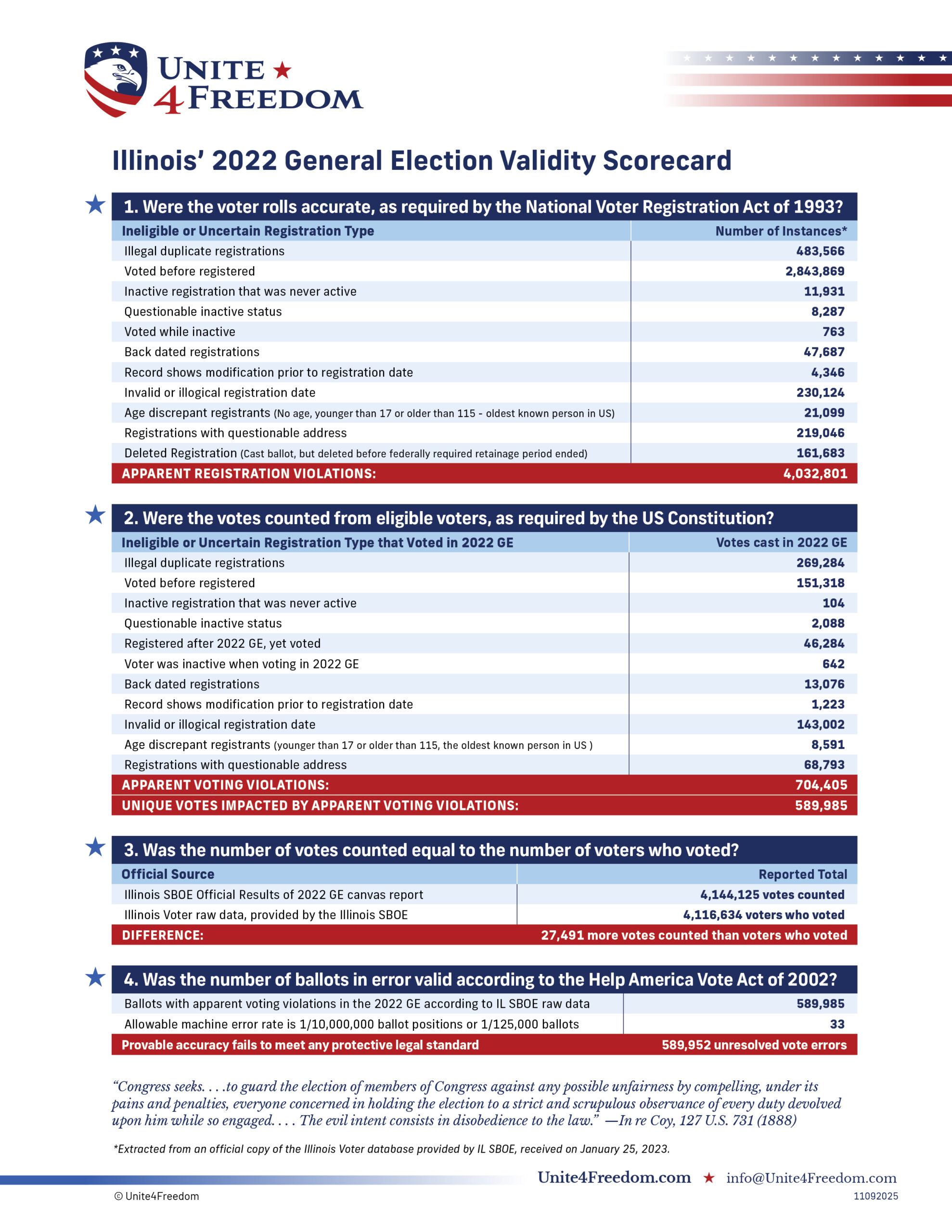 Unite4Freedom is the first organization in the country to conduct these types of forensic audits using each state’s own official data. The result is undeniable—millions of votes across the country, certified as accurate by election officials, originate from registrations that appear to violate election laws.