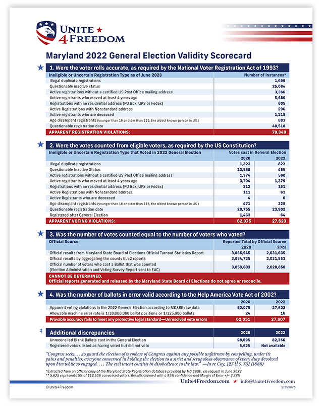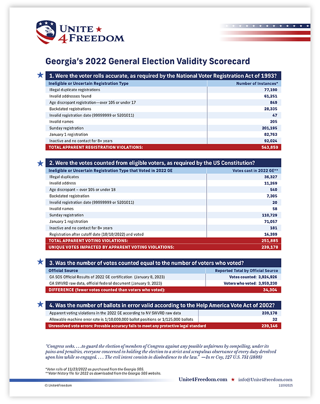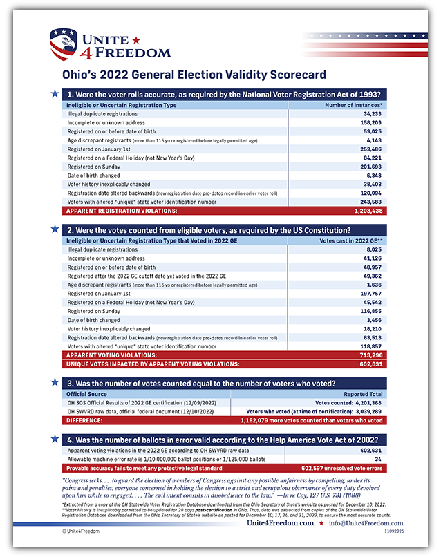 The results of the analyses completed using each state’s official records are compiled into an Election Validity Scorecard (21 of which are shown below), which expose apparent legal violations in voter registrations, votes, counts, and allowable errors.